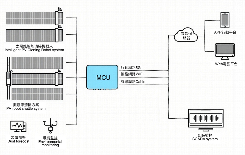 此外,AI 清洗機器人結合了擺渡車清掃方案、自動偵測模組邊緣、低電量自動回充,以及強力傳動馬達驅動等功能,能輕鬆跨越模組高低差與縫隙,實現整場清潔。另透過遠端 APP 或 PC 監控,使用者可即時查詢機器人電量與清潔進度,支援預定時間清洗,真正達到人力成本精簡化的目標。