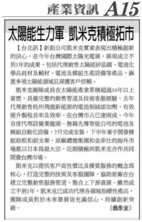 太陽能生力軍 凱米克積極拓市-經濟日報2018.10.39/30經濟日報新聞稿全文: https://money.udn.com/money/story/11799/3394547 https://kymical.com.tw/wp-content/uploads/2026/03/news-20181001.jpg 773 496 kyle /wp-content/uploads/2026/02/凱米克實業_logo-01.png kyle2018-10-03 12:01:292026-03-12 12:03:49太陽能生力軍 凱米克積極拓市-經濟日報