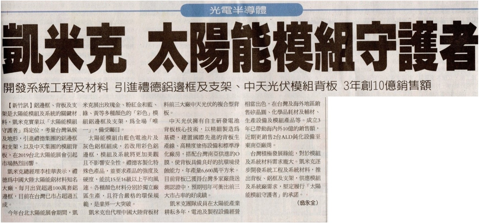 凱米克實業有限公司於2019年10月太陽能國際智慧能源展會中接受到經濟日報的專訪,於2019年11月18日於經濟日報C4版報紙刊登。內文如下: